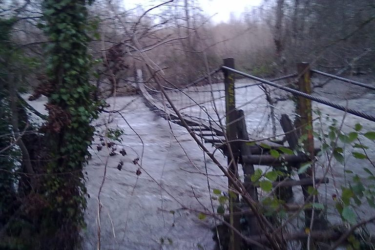 Después de pasar el paraje de las barrancas camino de Villaverde de la Abadía por el margen izquierdo del rio Sil, nos encontramos con un atrevido puente colgante que nos invita a pasar a los prados de Villaverde. Se trata de un puente centenario, aunque dicen que antes estuvo en otro lugar cercano, y con las consiguientes reparaciones para su conservación ha llegado hasta nuestros días. También cuenta con una parte negra en su historia por una triste tragedia, por lo que la precaución en su uso es siempre recomendable, aunque el caudal habitual del río no se corresponde con el de la foto, sacada con motivo de una importante crecida.